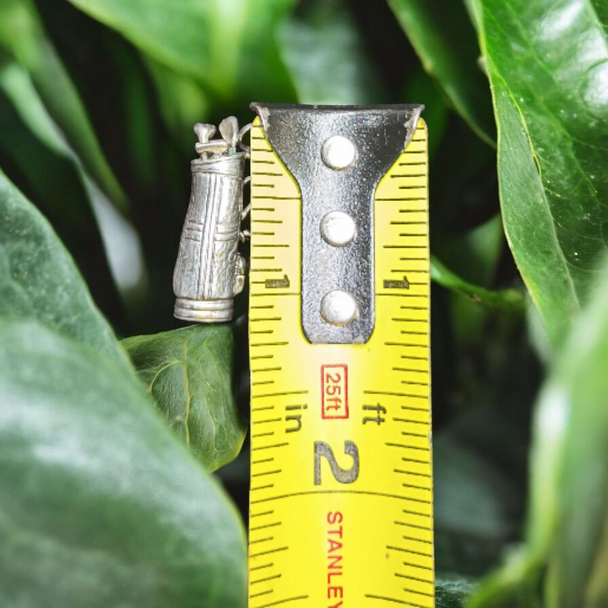 This vintage Danecraft sterling silver charm pendant captures the essence of golf with a detailed 3D golf bag design. Measuring 1 1/2 inches, it combines craftsmanship and timeless appeal, making it an ideal addition for collectors or enthusiasts seeking a refined accessory that honors the sport. Its sturdy sterling silver construction ensures lasting quality and classic shine.