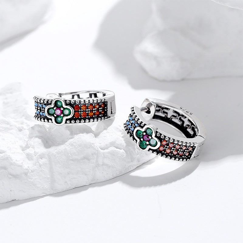 French Retro Style Four Leaf Colorful Diamond Earrings
