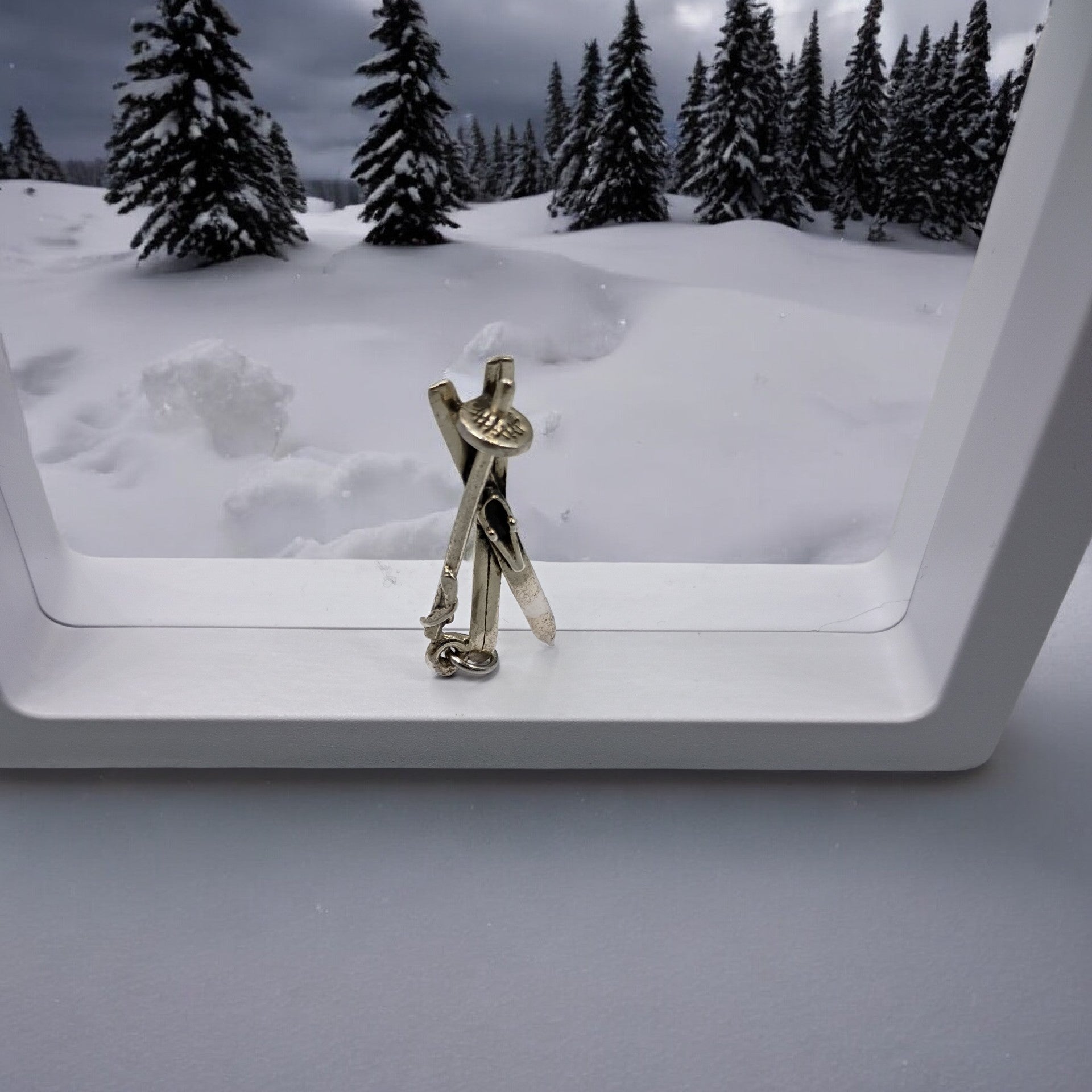 Hit the slopes in style with this charming vintage 3D silver ski poles and skis charm! Intricately designed to capture the thrill of alpine adventure, this nostalgic piece celebrates your passion for winter sports and mountain memories.