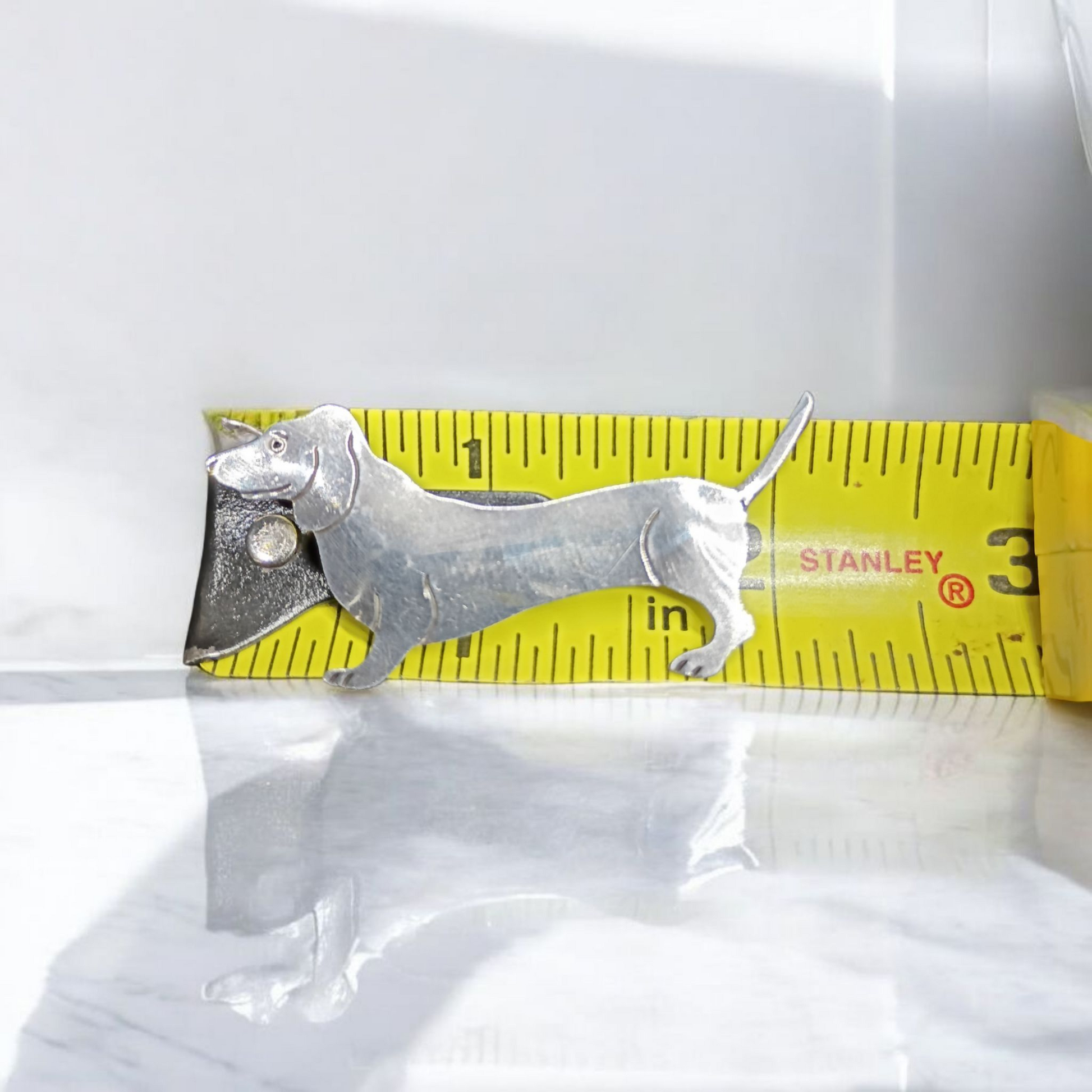 This vintage sterling silver brooch captures the distinctive charm of a dachshund in a finely crafted design. Measuring approximately 1 inch by 2 inches, its substantial size makes it a striking accessory while maintaining elegant subtlety.
