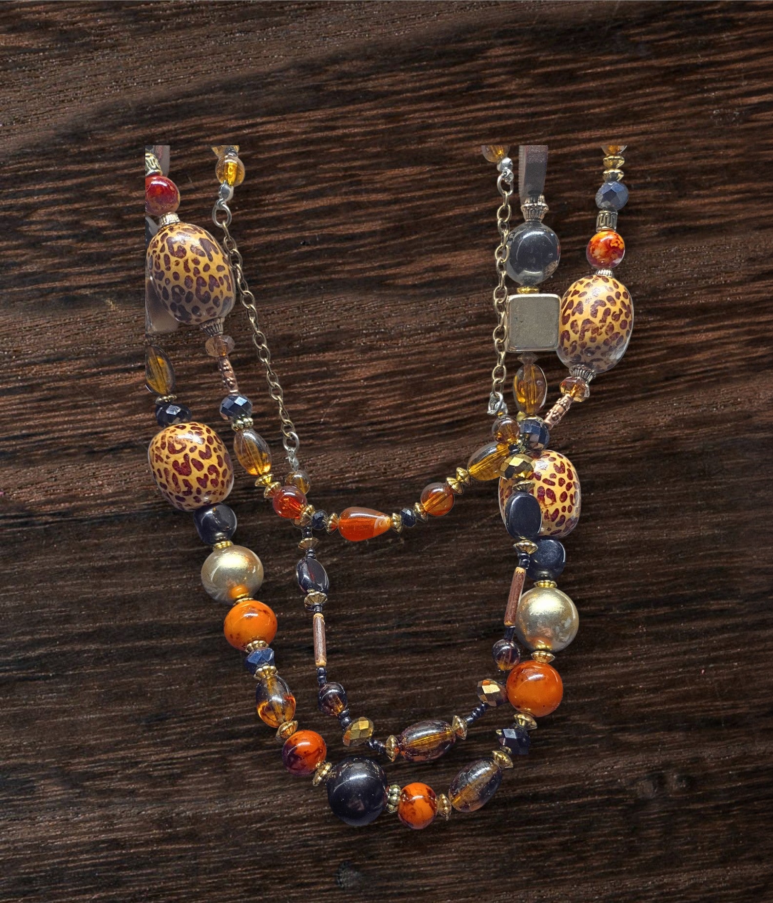 This vintage mid-century necklace features a sophisticated three-layer beaded station design, the longest strand measuring 16 inches for a balanced, elegant fit. Meticulously crafted beads are strategically spaced to create depth and texture, reflecting timeless mid-century style. Ideal for collectors or refined accessorizing, this piece combines historical significance with versatile wearability for a distinguished, layered look.