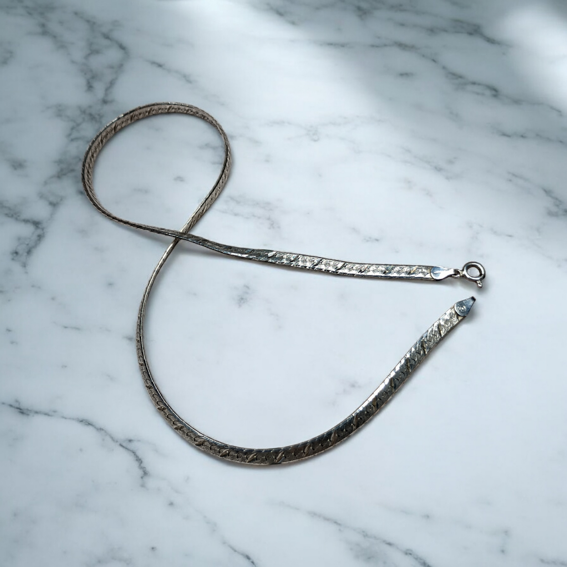 This vintage 925 sterling silver herringbone chain, measuring 18 inches in length and 5.0mm in width, offers a timeless and elegant design. Crafted from high-quality sterling silver, its flat, woven pattern reflects light beautifully, making it a sophisticated accessory for any collection. Durable yet flexible, it rests comfortably around the neck, suitable for both casual and formal wear. A classic piece that combines craftsmanship with enduring style.