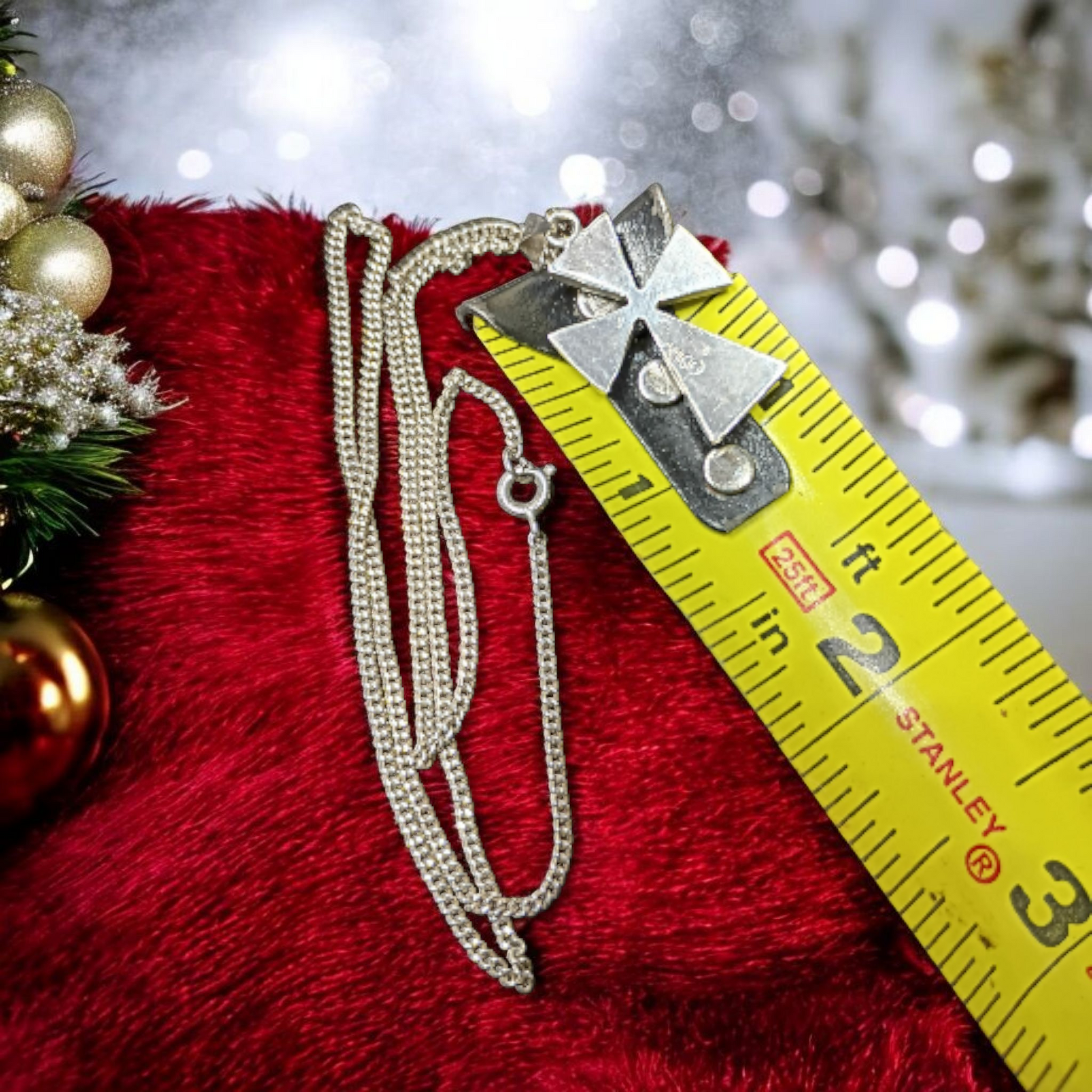 This vintage sterling silver small curb chain features an 18-inch length designed to sit comfortably around the neck and chest at 9-inch. It is complemented by an abalone cross pendant measuring 1 inch by 1 inch, showcasing unique iridescent color patterns. Crafted for durability and timeless style, this piece combines classic curb chain construction with the natural beauty of abalone, making it a distinctive addition to any jewelry collection.